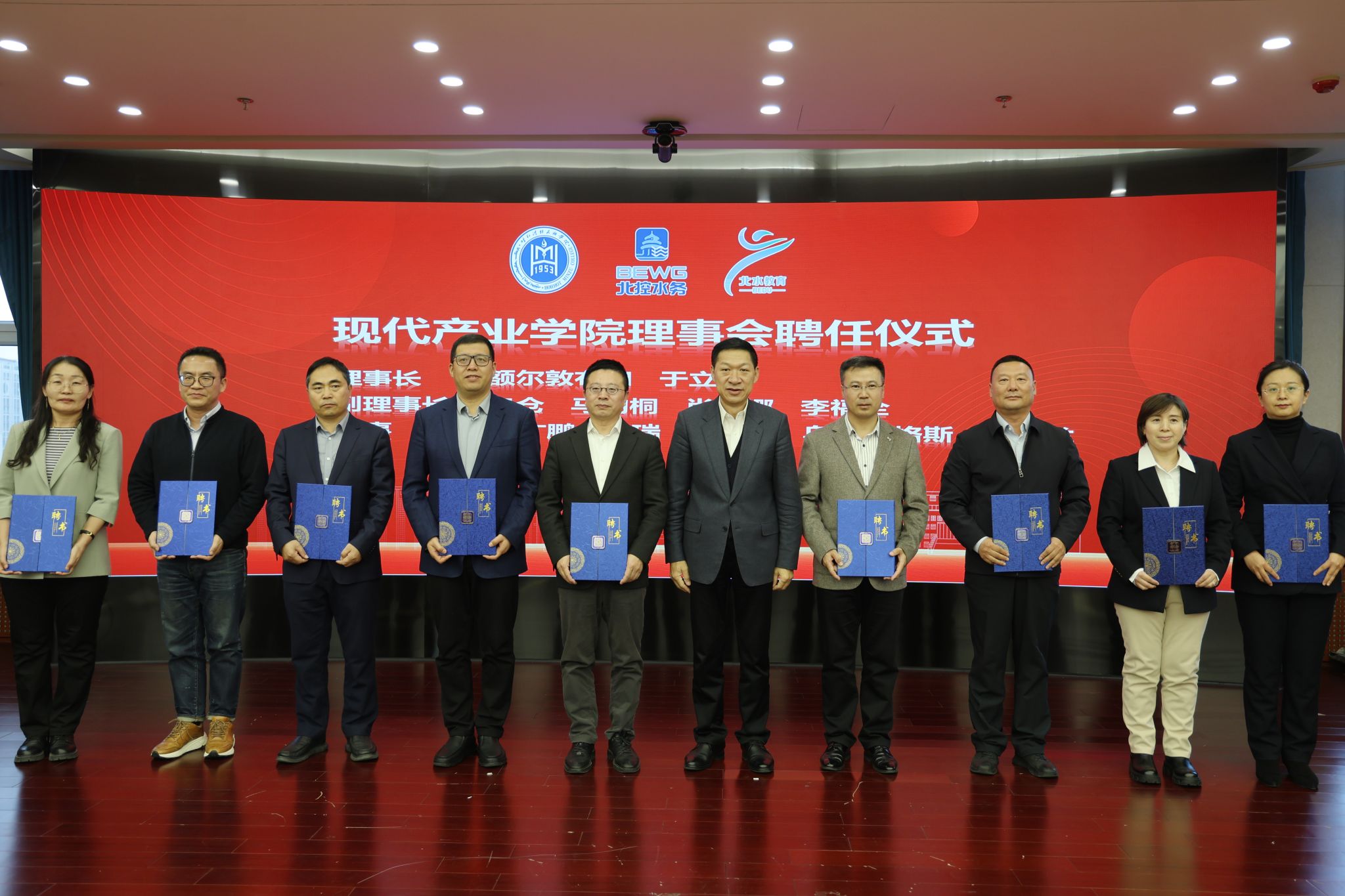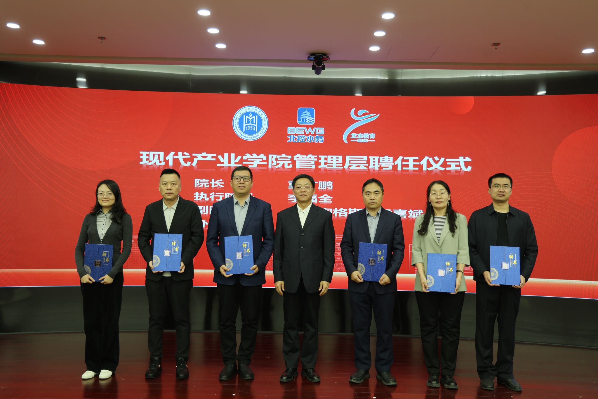 高喜天代表學校為現代產業學院管理層頒發聘書,冀廣鵬理事兼任現代產業學院院長,李福全副理事長兼任現代產業學院執行院長,烏仁陶格斯、殷喜斌任現代產業學院執行副院長。