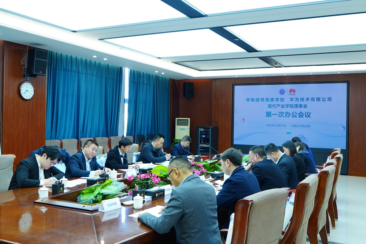 儀式結(jié)束后,舉辦了華為現(xiàn)代產(chǎn)業(yè)學(xué)院理事會第一次辦公會議。由理事長額爾敦布和作關(guān)于現(xiàn)代產(chǎn)業(yè)學(xué)院章程起草的說明,理事會全體成員審議章程并表決通過。執(zhí)行院長包烏格德勒詳細(xì)介紹了產(chǎn)業(yè)學(xué)院的發(fā)展規(guī)劃,與會人員圍繞發(fā)展規(guī)劃展開深度研討。