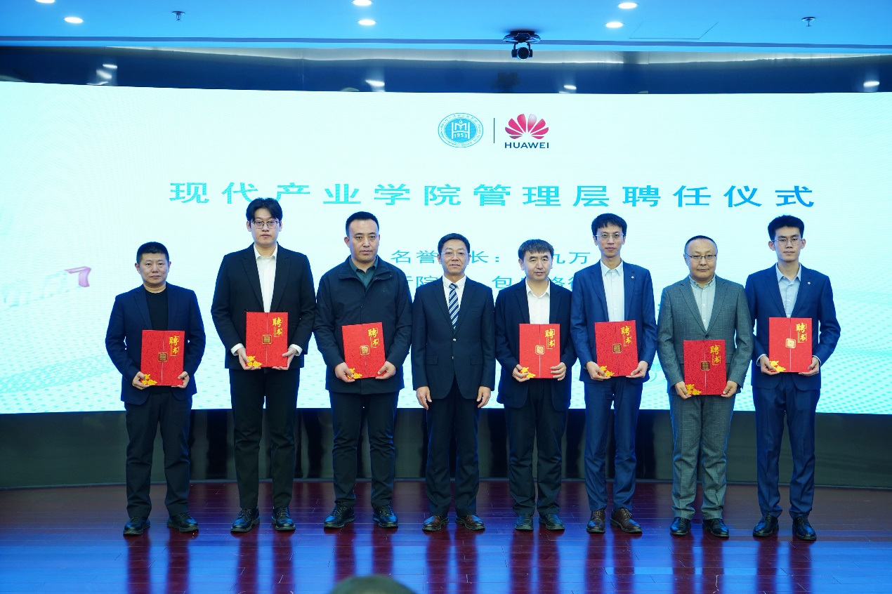 期間,進(jìn)行了華為現(xiàn)代產(chǎn)業(yè)學(xué)院管理層聘任儀式。劉九萬任名譽(yù)院長。高喜天為管理層相關(guān)人員頒發(fā)聘書。包烏格德勒任執(zhí)行院長,色登丹巴、于海奇、郝鑫宇任副院長,楊恒毅、郭富、任杰任辦公室成員。
