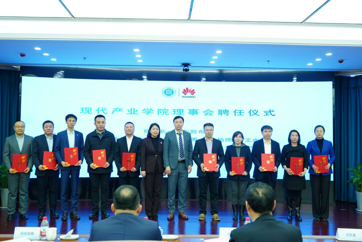 期間,進(jìn)行華為現(xiàn)代產(chǎn)業(yè)學(xué)院理事會聘任儀式,由格根哈斯、黨張波為理事會成員頒發(fā)聘書。額爾敦布和任理事長,包倉、王傳杰、肖查娜、包烏格德勒、王水英任副理事長,郝鑫宇、于海奇、齊瑞、杜鳳懿、色登丹巴任理事。