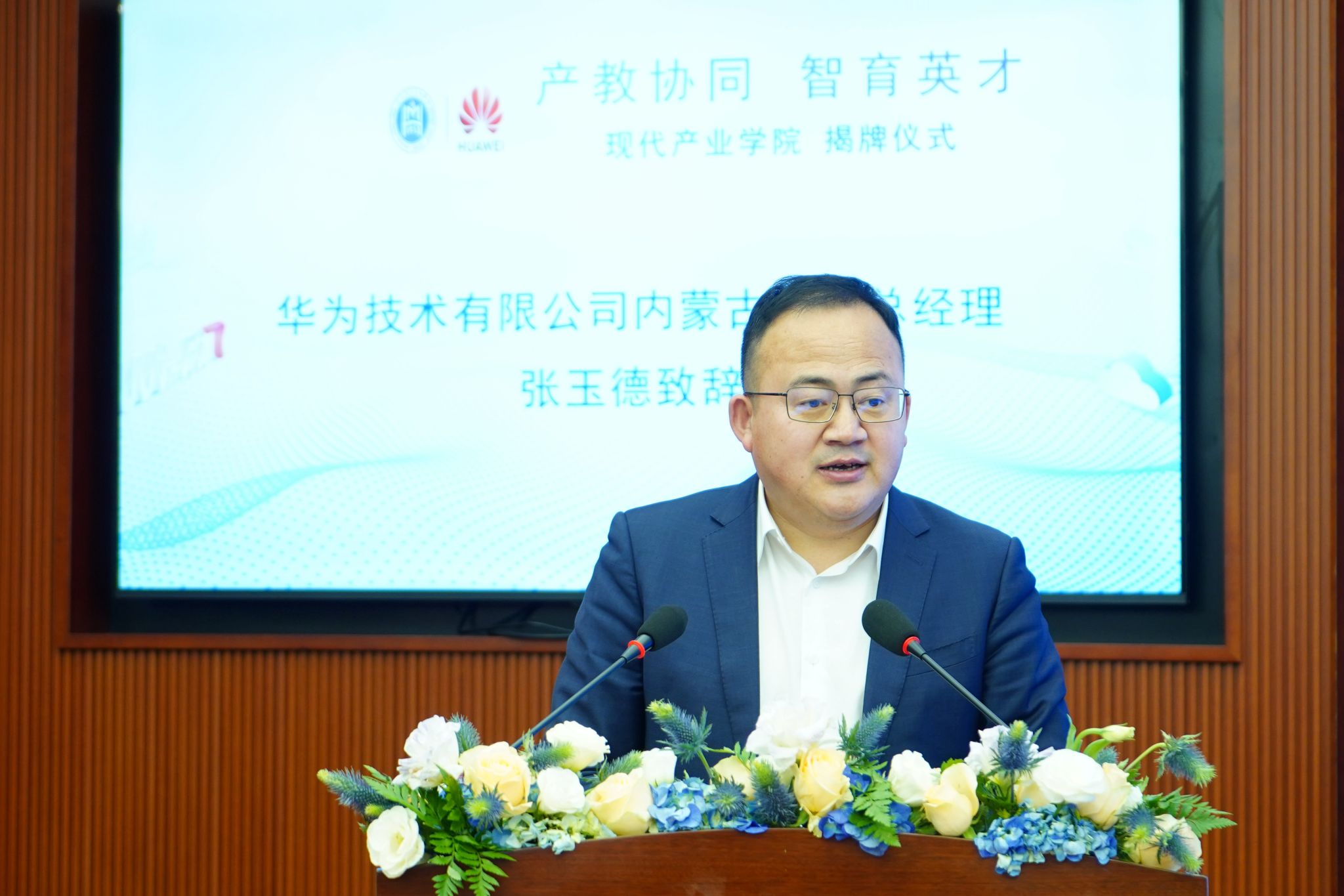 額爾敦布和在儀式上致辭。他簡要介紹了學(xué)校的辦學(xué)歷史,表示學(xué)校高度重視現(xiàn)代產(chǎn)業(yè)學(xué)院的建設(shè)工作。他指出,今天的揭牌儀式標(biāo)志著我校與華為在產(chǎn)教深度融合、協(xié)同育人方面邁出了堅實(shí)的一步,也是貫徹新發(fā)展理念、對標(biāo)教育部現(xiàn)代產(chǎn)業(yè)學(xué)院建設(shè)標(biāo)準(zhǔn)的有力實(shí)踐。他希望,現(xiàn)代產(chǎn)業(yè)學(xué)院在人才培養(yǎng)的道路上不斷前行,進(jìn)一步拓展合作領(lǐng)域,深化合作層次,不僅在技術(shù)研發(fā)、成果轉(zhuǎn)化等方面加強(qiáng)協(xié)同創(chuàng)新,更要在國際交流與合作中共同探索新機(jī)遇,助推學(xué)院提升國際影響力。