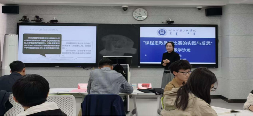 隨后,擬參加京津冀蒙本科高校課程思政教學比賽的包呈敏、楊耀天、王佳三位教師依次進行現場匯報,展示課程思政教學成果、闡述備賽思路。